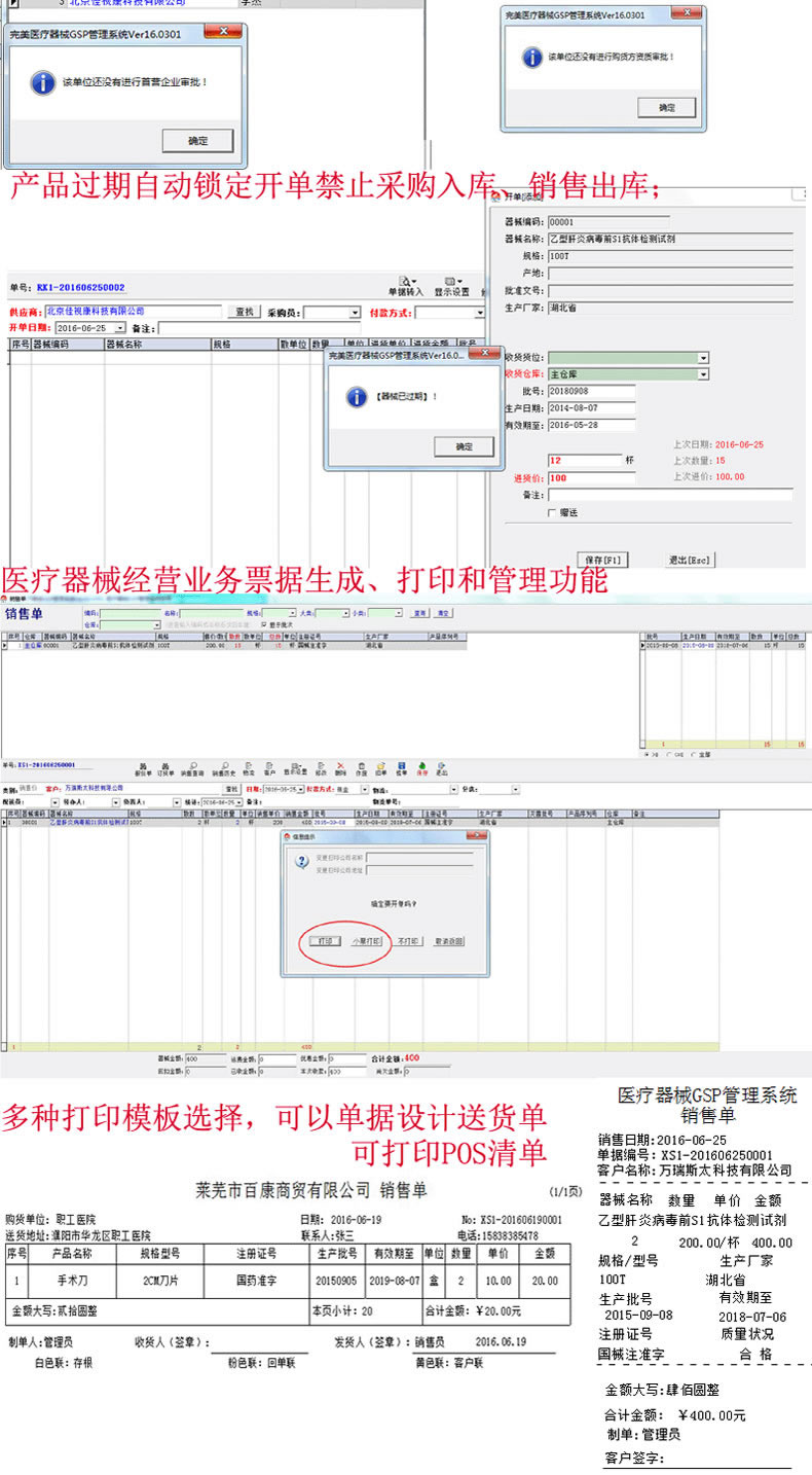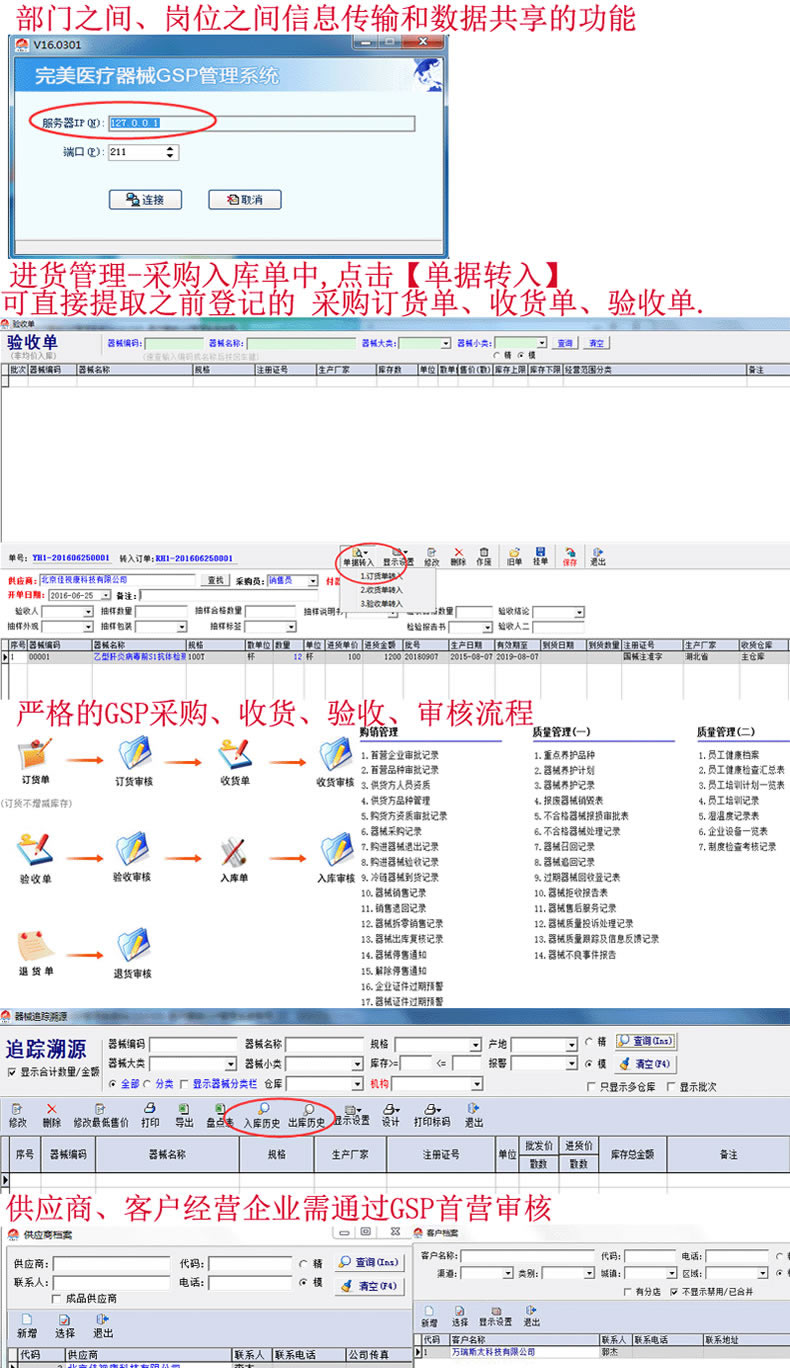 【我们的医疗器械软件 符合药监部门最新验收标准】:系统严格按照国家药监部门医疗器械质量管理规范的要求开发,系统不仅提供首营管理、入库验收、出库复核、库存养护、效期药品催销等的整套质量管理规范流程控制,相关质量管理记录自动生成,在广东省、江西省、辽宁省、福建省、浙江省、云南省、江苏省、海南省、河南省、河北省、湖北省、湖南省、山西省、山东省、安徽省、黑龙江省、四川省、贵州省、陕西省、甘肃省、青海省、广西、新疆、内蒙古、西藏、宁夏、北京市、上海市、广州市、深圳市、重庆市、天津市等全国23个省、五个自治区和四个直辖市使用完美双赢医疗器械软件的医疗器械企业都通过药监验收。