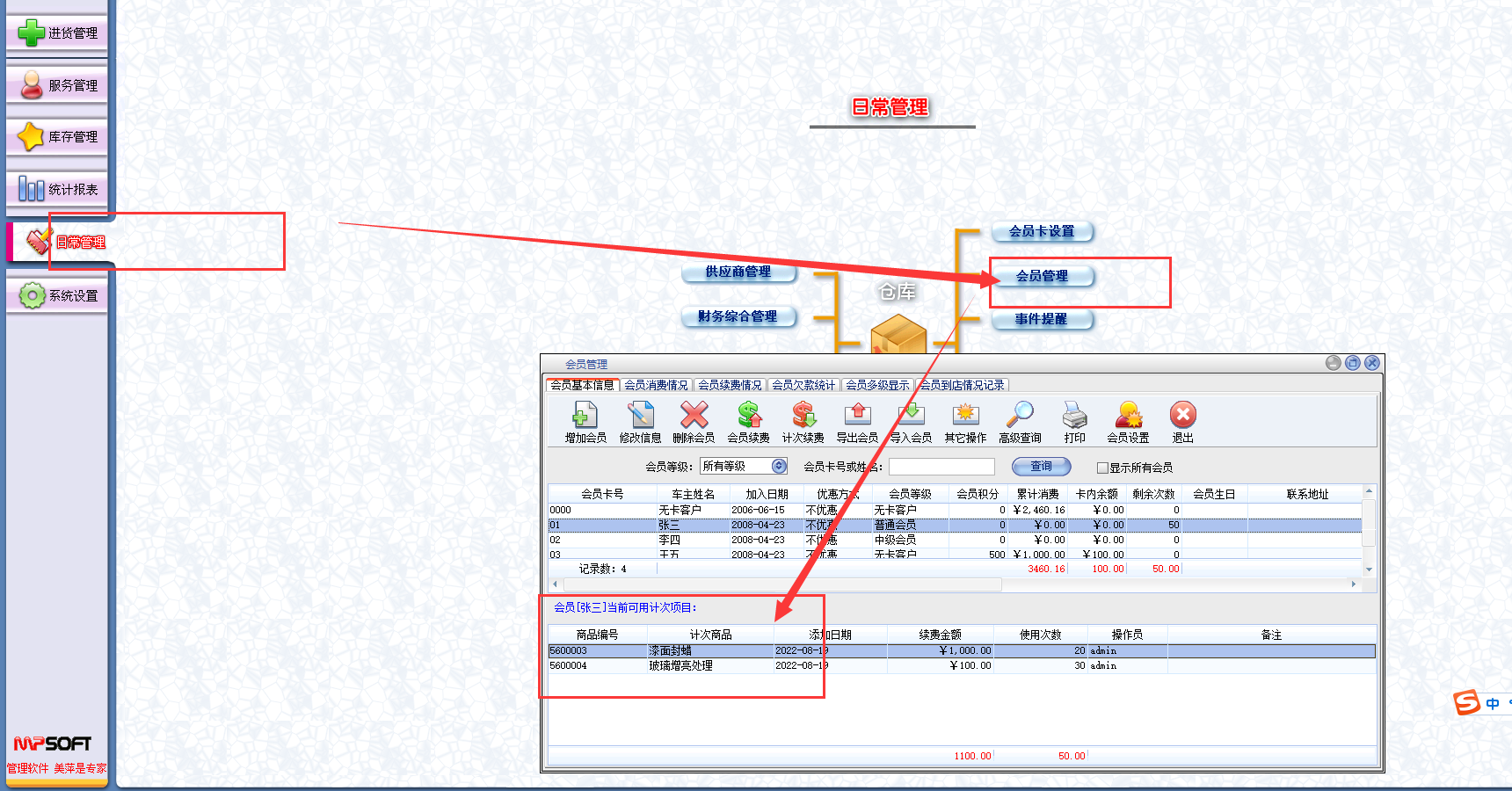 美萍汽车服务行业管理软件,如何知道会员卡现在卡里还有剩余什么项目?